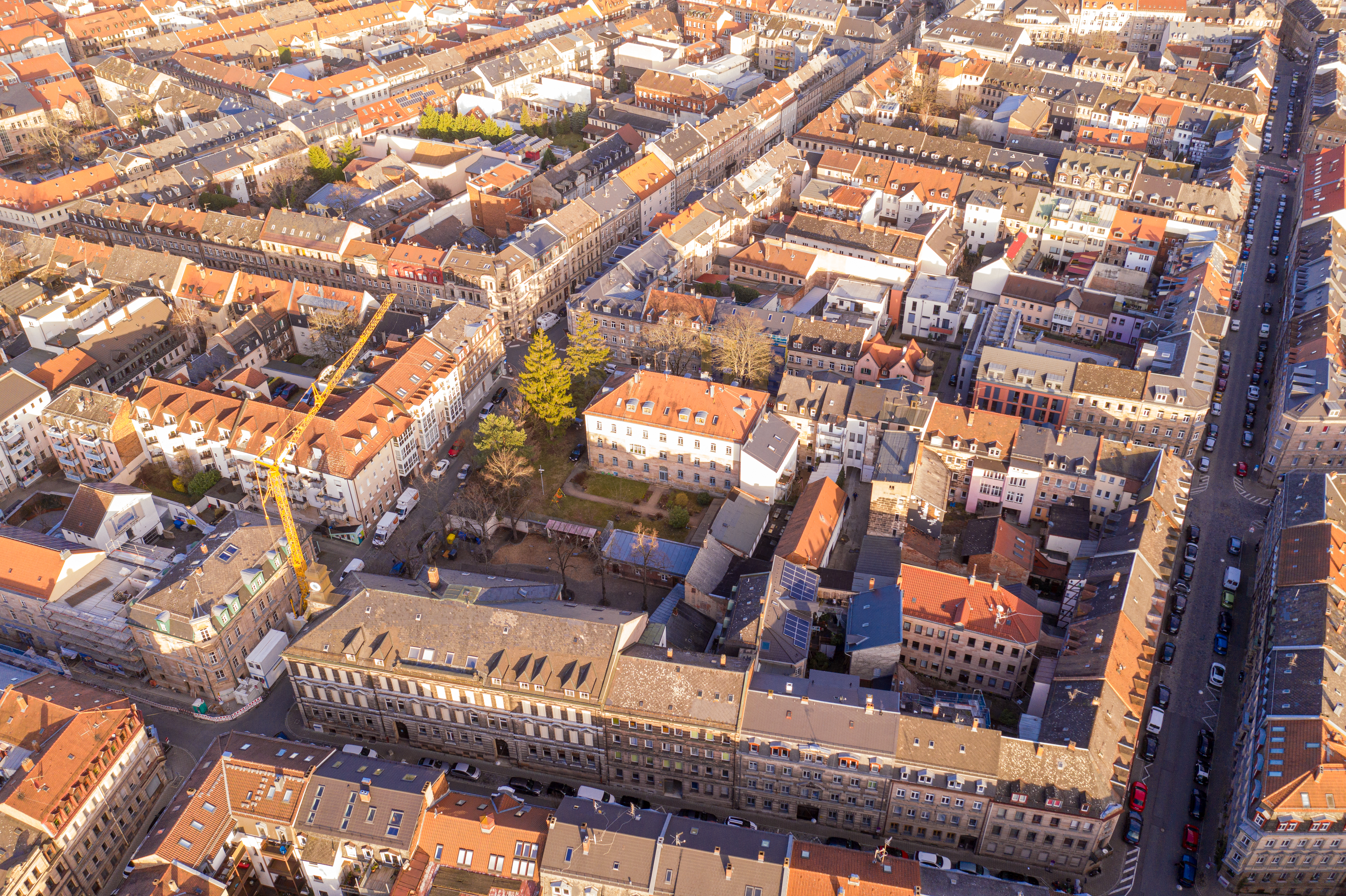 | Beschreibung | Blick über die Theaterstraße (in etwa mittig, von links nach rechts laufend), Pfisterstraße (parallel dazu unten), Marienstraße (rechts, von unten nach oben), Mathildenstraße (links, von unten nach oben); März 2020 – im Zentrum das ehem. Jüd. Krankenhaus; Blickrichtung Osten | ||