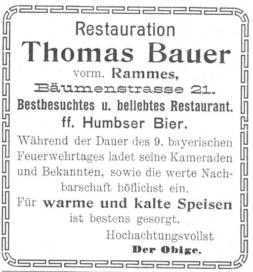 | Beschreibung | Werbeannonce von Thomas Bauer für sein Restaurant, August 1900 | ||
