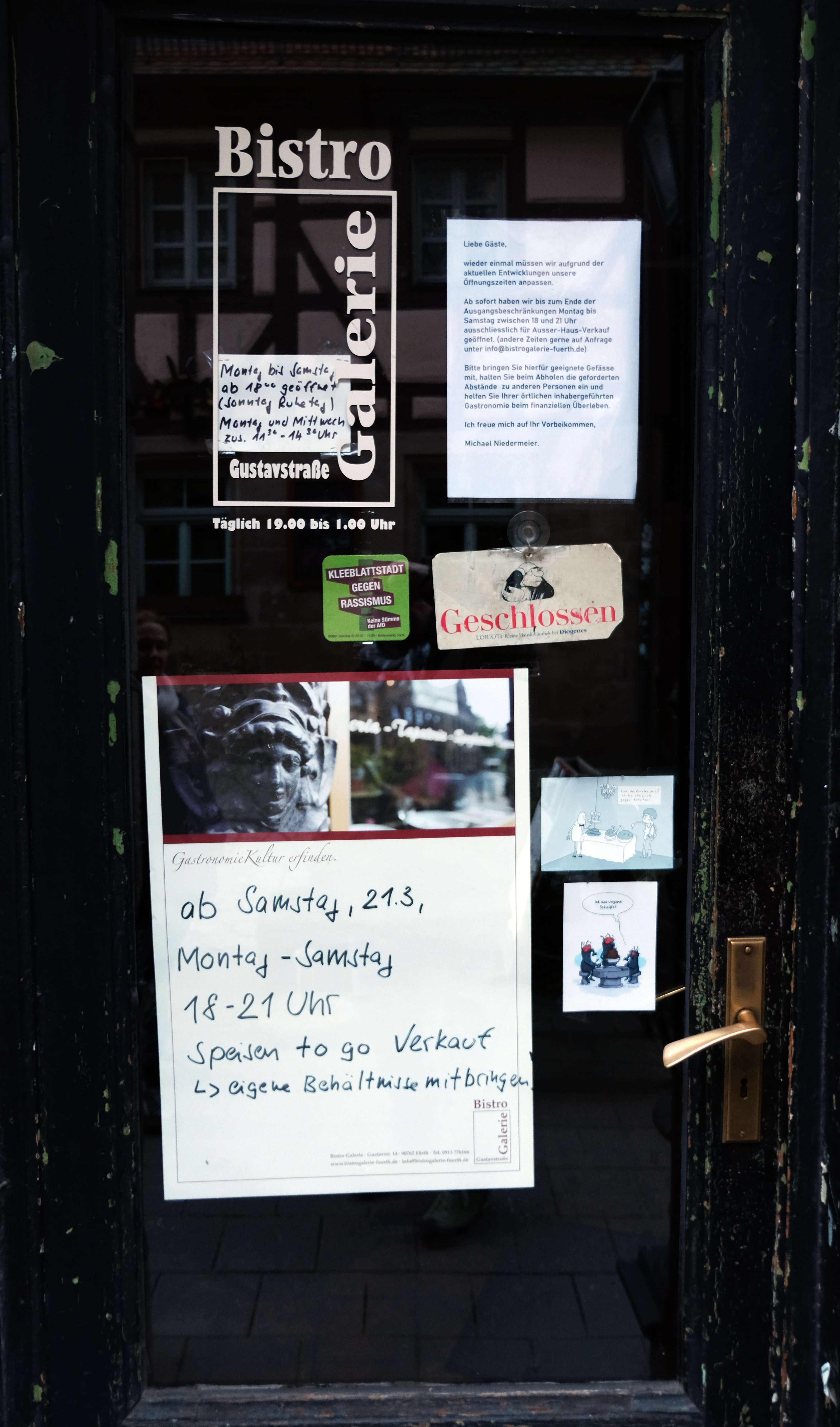 | Beschreibung | Angebot von ToGo-Essen einiger Gaststätten, hier Bistro Galerie in der Gustavstraße, März 2020 | ||