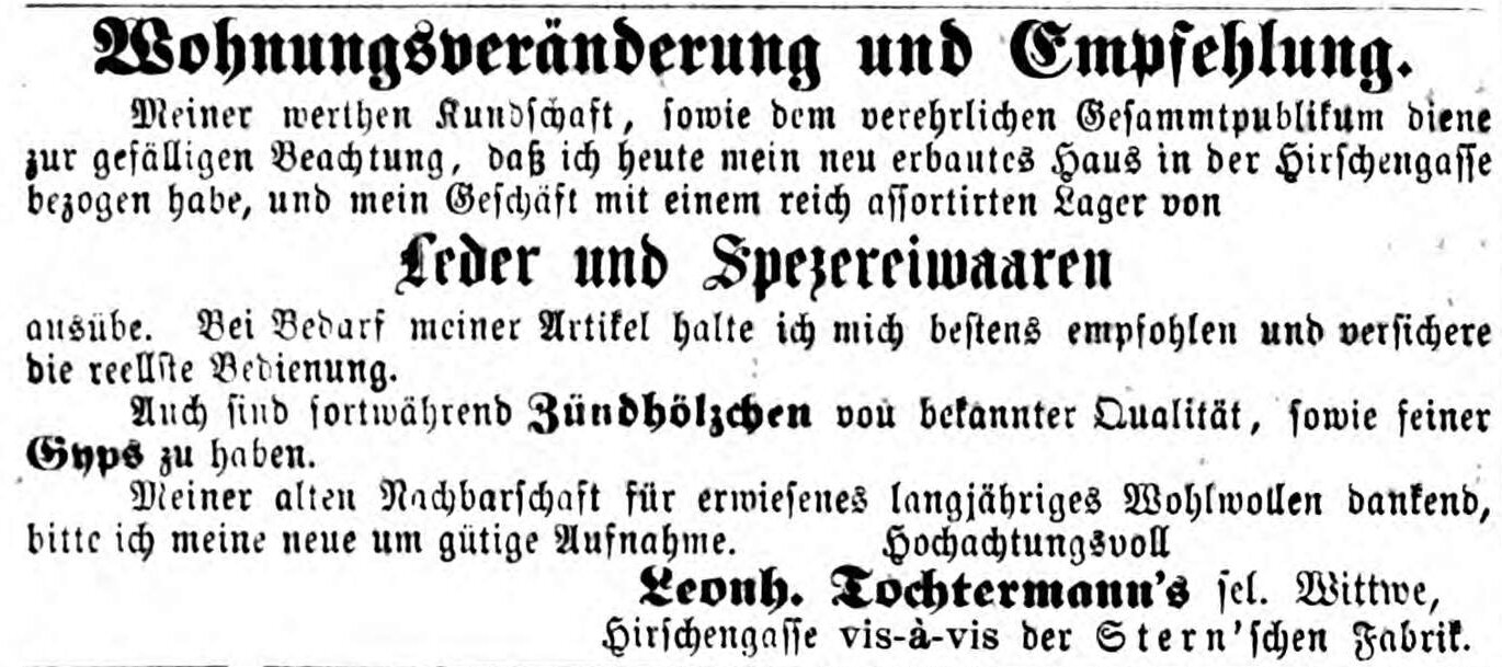 | Dateiinfo (Bild-Unterschrift und Info-Box, automatisch erstellt) | Neuerbautes Haus der Witwe Tochtermann in der Hirschengasse, November 1862 Lizenz: NoC-NC 1.0 | ||