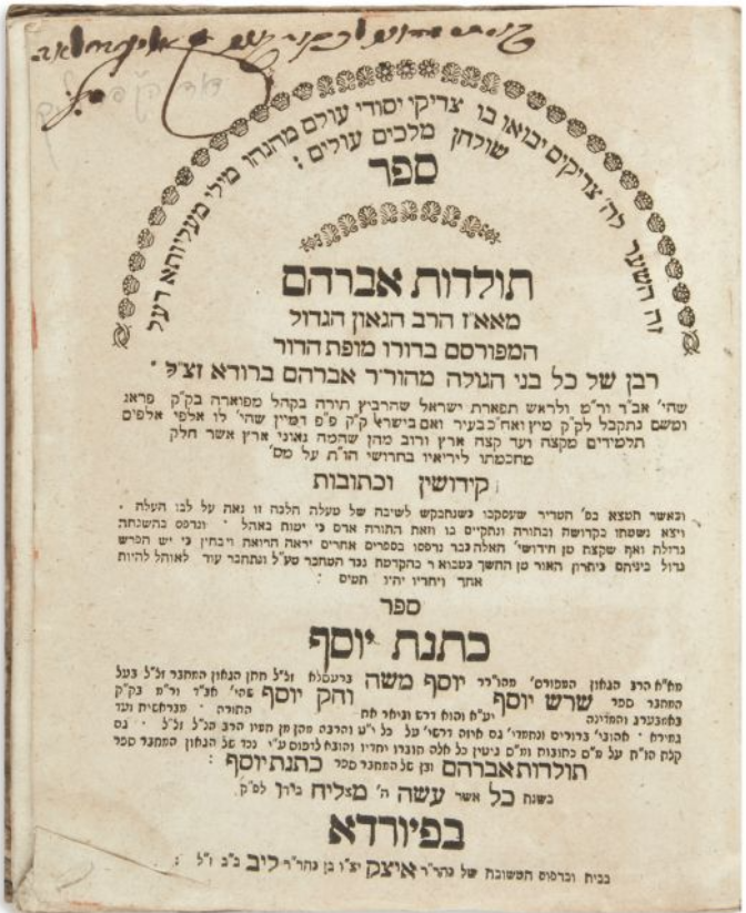 | Beschreibung | Toldoth Abraham, Itzik Buchbinder (Bamberger), 1769 | ||