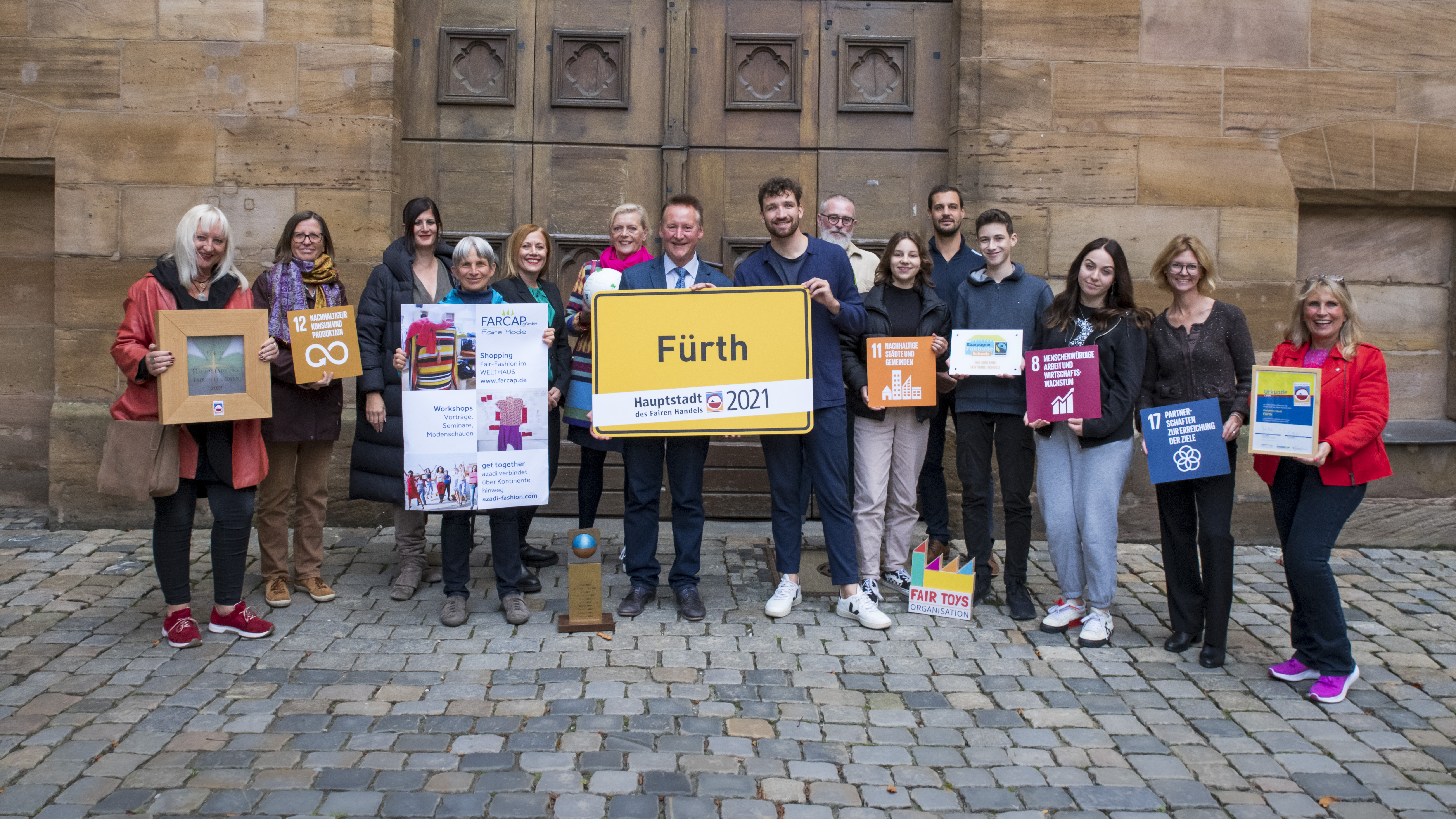 Gruppenfoto (verschiedene Institutionen aus Fürth, die Fairen Handel unterstützen) vom 26.09.2022 im Rathausinnenhof - Auszeichnung der Stadt Fürth als Hauptstadt des Fairen Handels - Foto von Tom Schrade (Engagement Global)