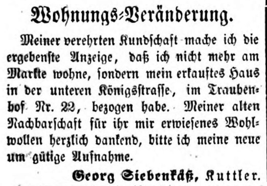 | Beschreibung | Zeitungsanzeige von Georg Siebenkäß, August 1856 | ||