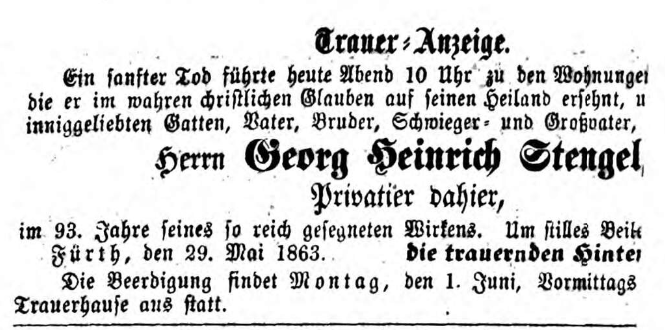 | Beschreibung | Traueranzeige für Georg Heinrich Stengel, Fürther Tagblatt vom 31. Mai 1863 | ||