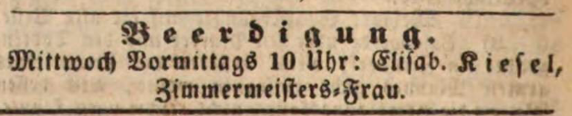 | Beschreibung | Beerdigungsanzeige Elisabetha Kiesel (1. Ehefrau des Joh. Melchior Kiesel), Mai 1849 | ||