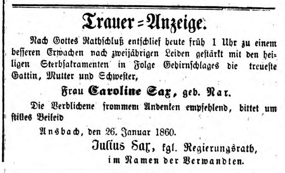 | Beschreibung | Traueranzeige Caroline Sax, Fürther Tagblatt 27. Januar 1860 | ||