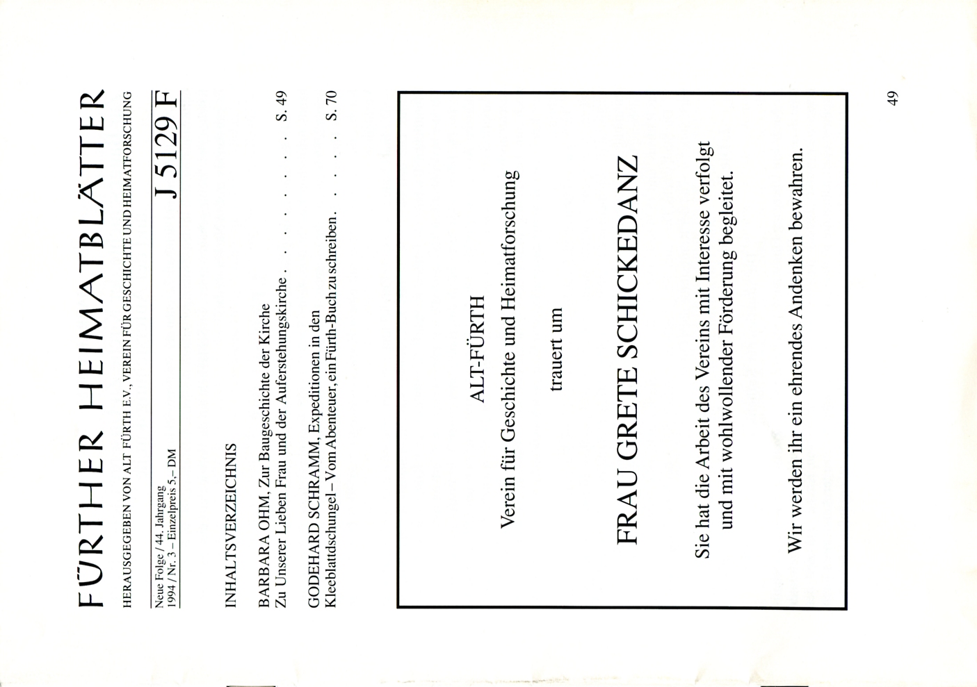 | Beschreibung | Traueranzeige für Grete Schickedanz. Titelseite der "Fürther Heimatblätter" vom Geschichtsverein Fürth im Juli 1994 | ||