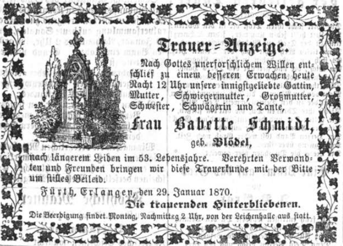 | Beschreibung | Traueranzeige für Babette Schmidt (2. Ehefrau) vom 29. Januar 1870 | ||