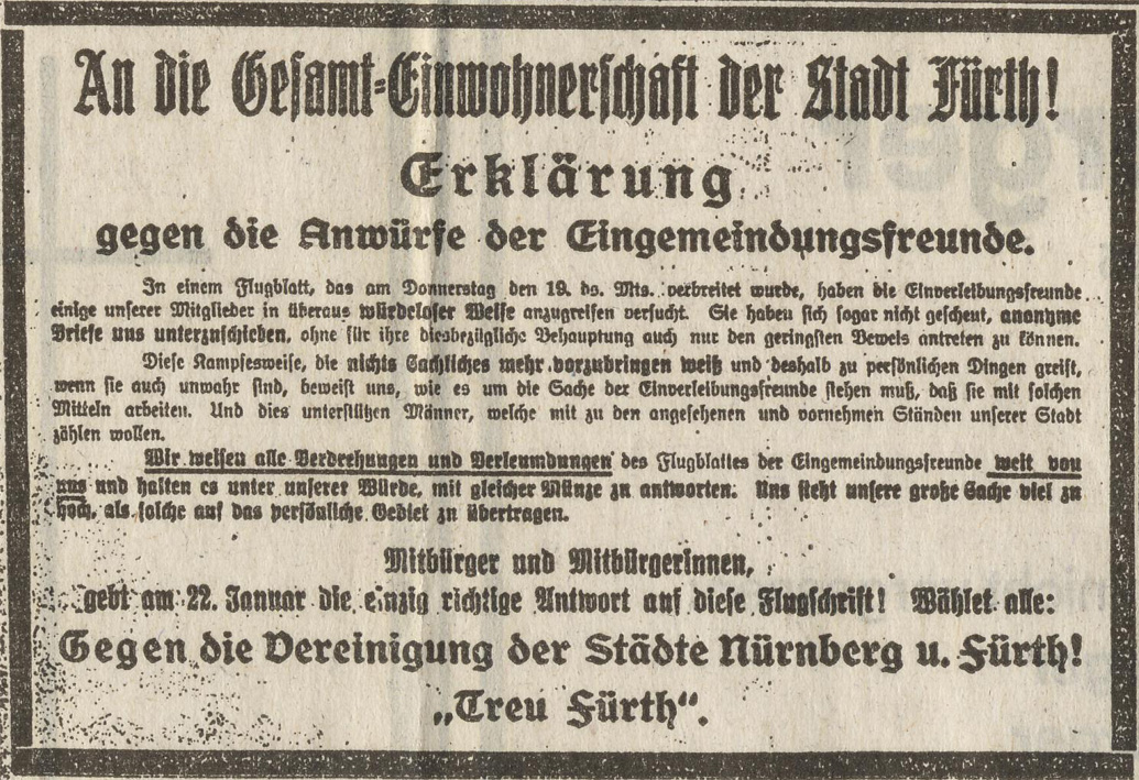 | Beschreibung | Anzeige des Vereins Treu Fürth bzgl. des Volksentscheids zur geplanten Eingemeindung von Fürth nach Nürnberg am 21. Januar 1922 | ||