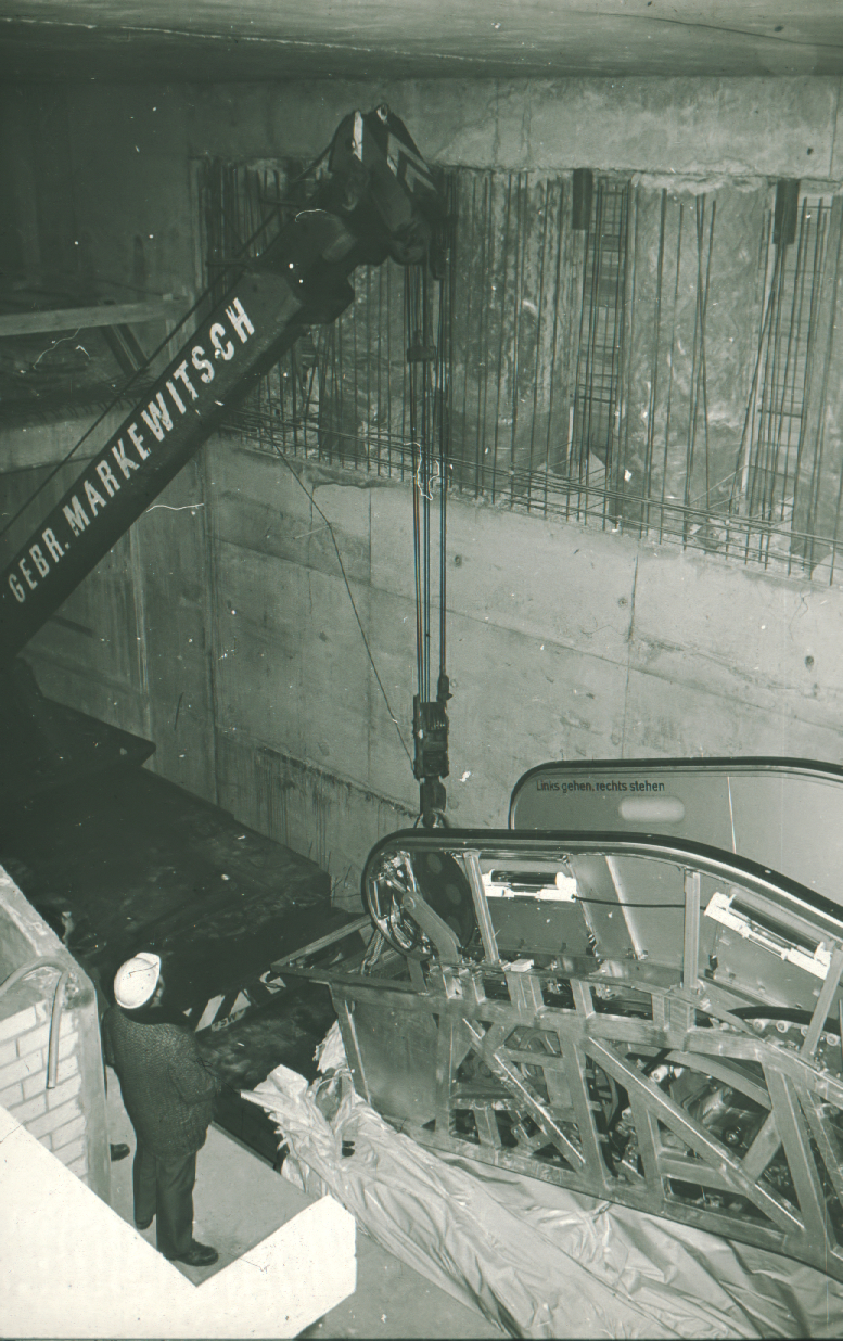 | Beschreibung | Baustelle U-Bahn, Aufrichten der Rolltreppen per Autokran im U-Bahnhof Jakobinenstraße | ||