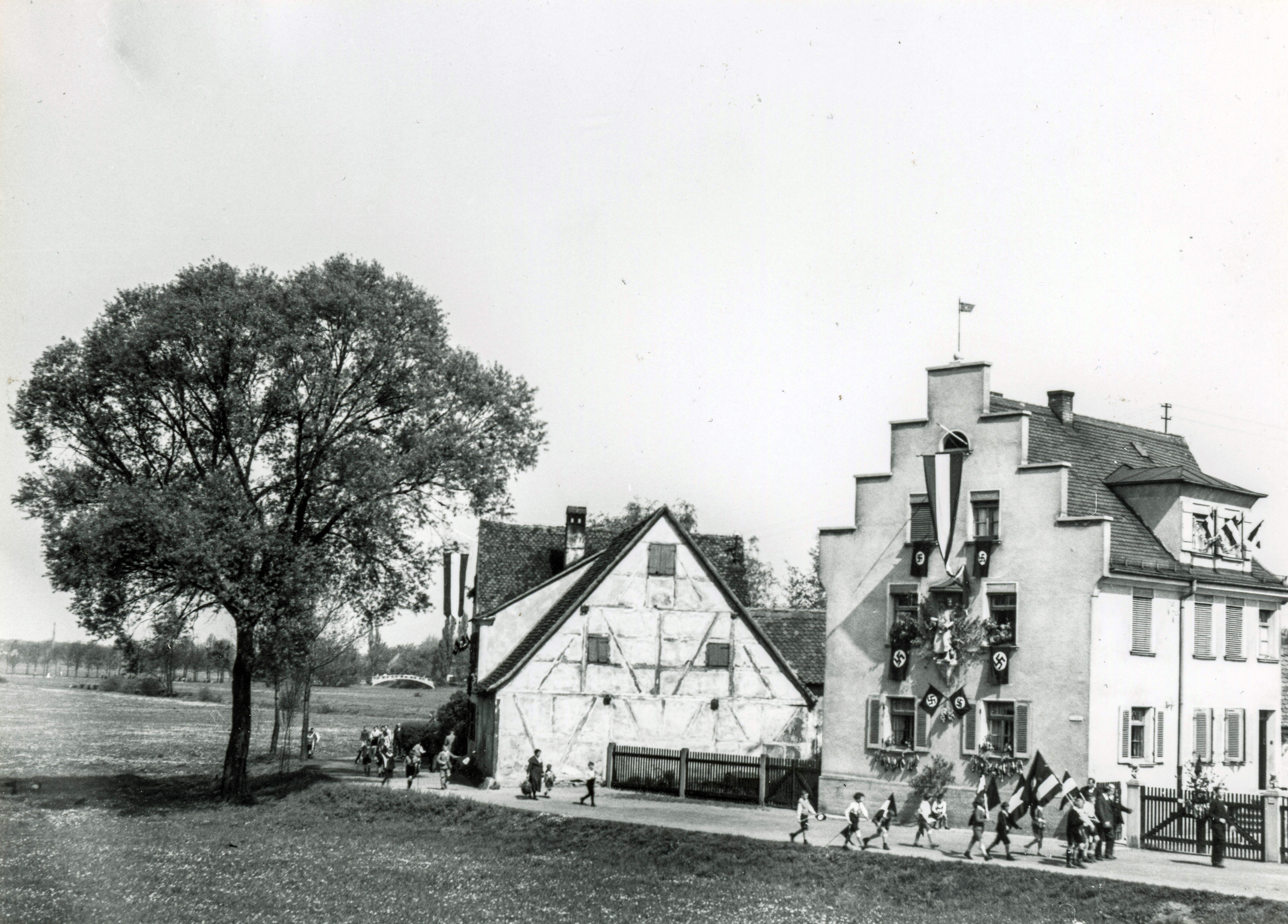 | Beschreibung | Das Gebäude Ulmenstraße 3 im Wiesengrund an der Ludwigsbrücke - mit NSDAP-Beflaggung - im Hintergrund das Batzenhäusla, ca. 1936 | ||