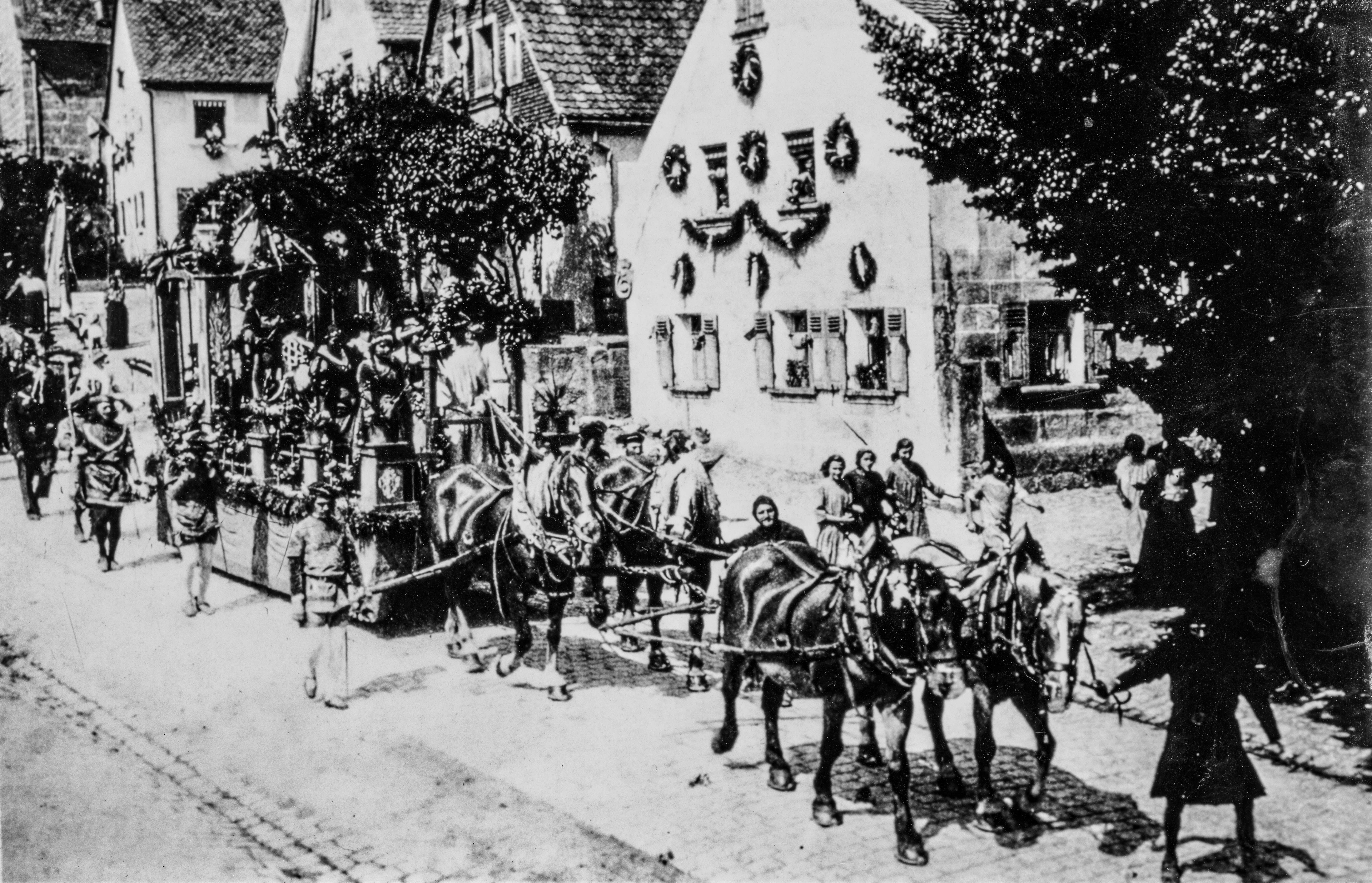| Dateiinfo (Bild-Unterschrift und Info-Box, automatisch erstellt) | Kirchweihumzug, vermutlich in Burgfarrnbach, ca. 1920 Urheber: unbekannt<br><br>Lizenz: CC BY-SA 4.0 | ||
