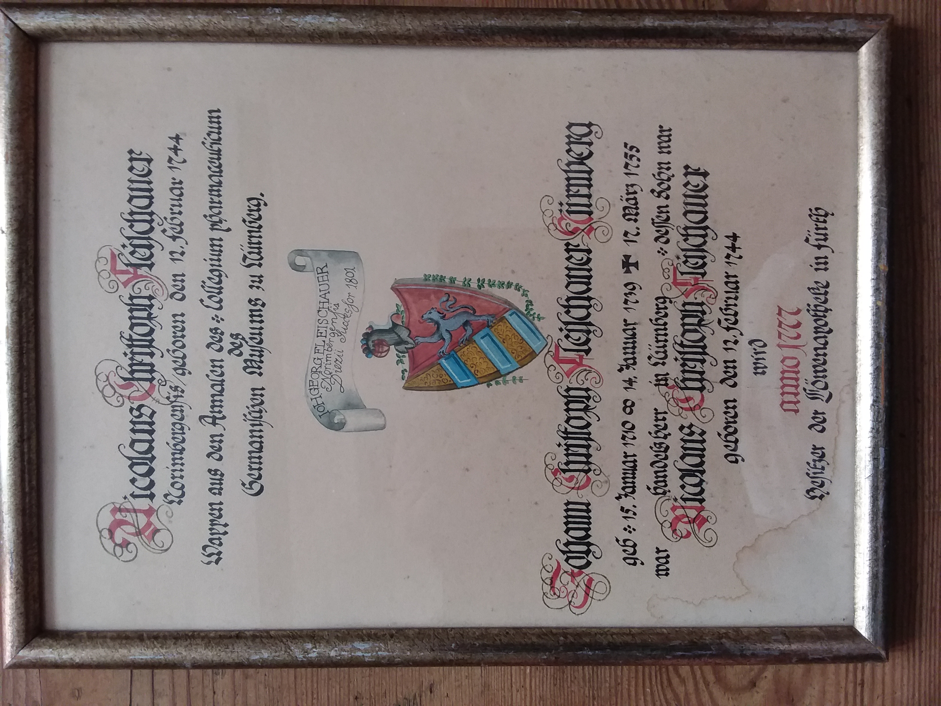 | Beschreibung | Urkunde über Johann Christoff Fleischhauer und dessen Sohn Nicolaus Christoph Fleischauer (allerdings enthält der Text ein falsches Geburtsdatum für Johann Christoff, als 29-Jähriger wäre eine 4. Ehe – wie im Familienstammbaum auf der Urkundenrückseite vermerkt – relativ unwahrscheinlich) | ||