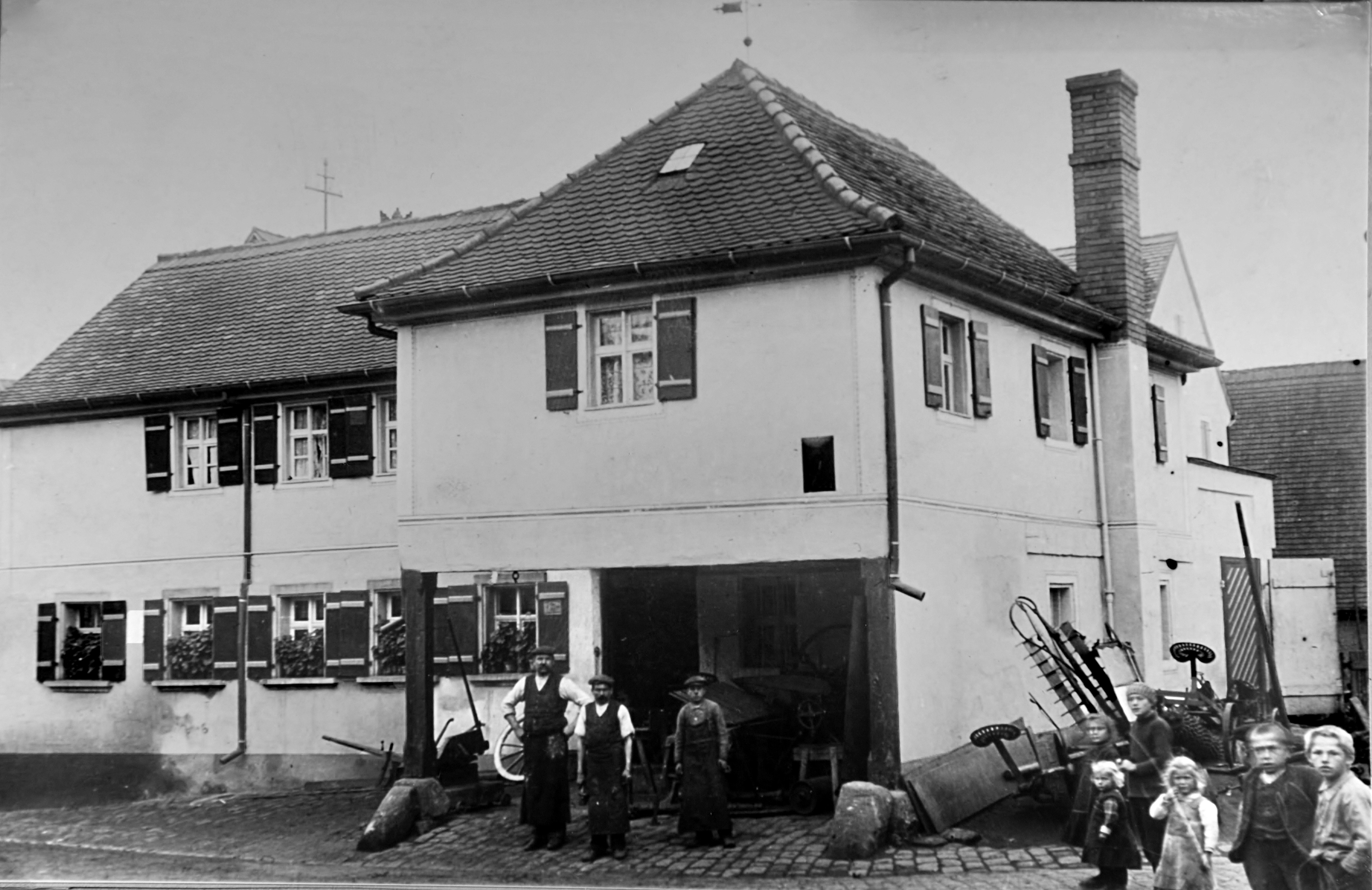 | Beschreibung | Die ehemalige Schmiede mit dem damaligen Betreiber Zehlein mit Helfern, ca. 1930 | ||