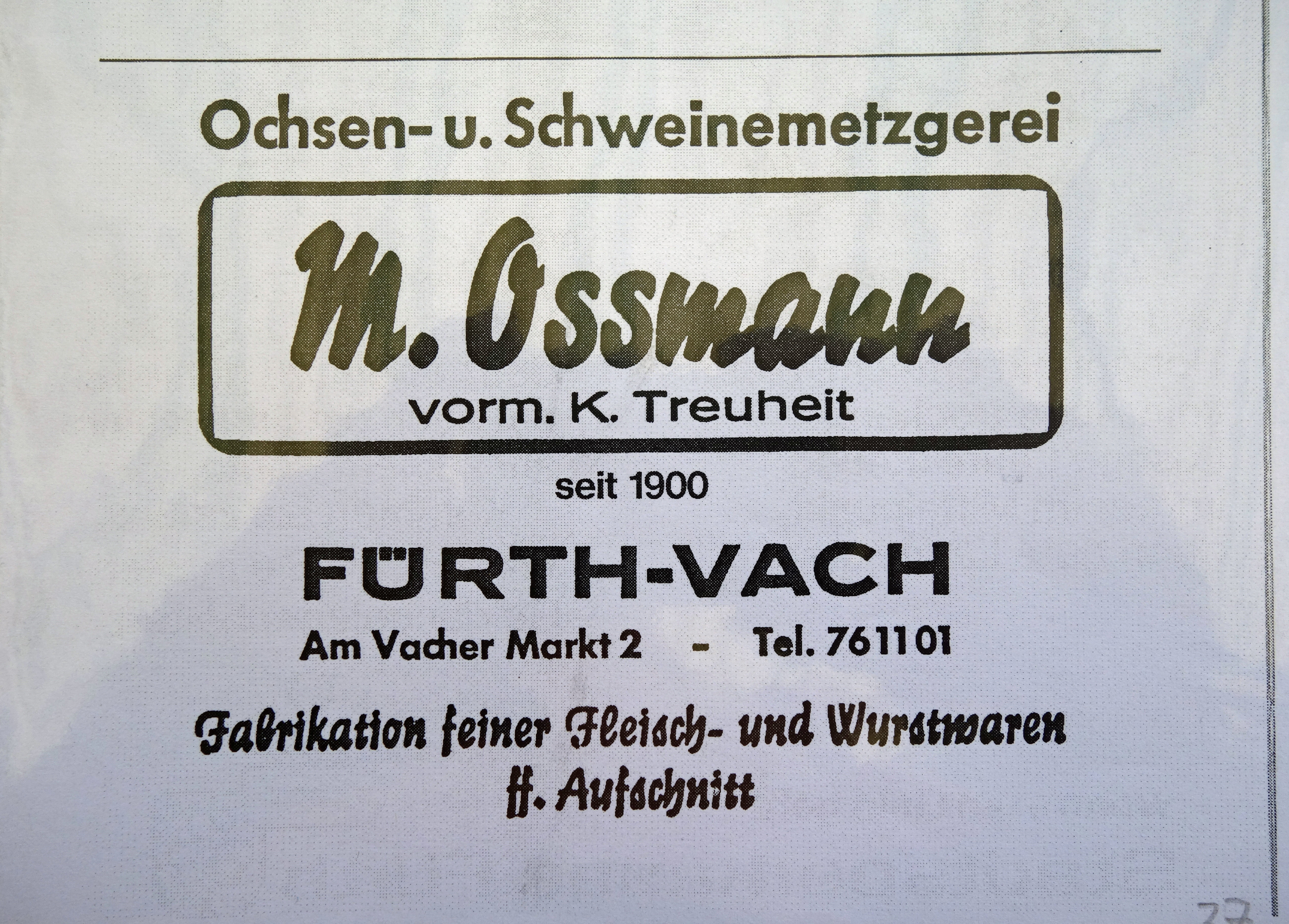 | Dateiinfo (Bild-Unterschrift und Info-Box, automatisch erstellt) | Werbung der ehemaligen Metzgerei Am Vacher Markt 2, etwa 1981 Lizenz: CC BY-SA 3.0 | ||