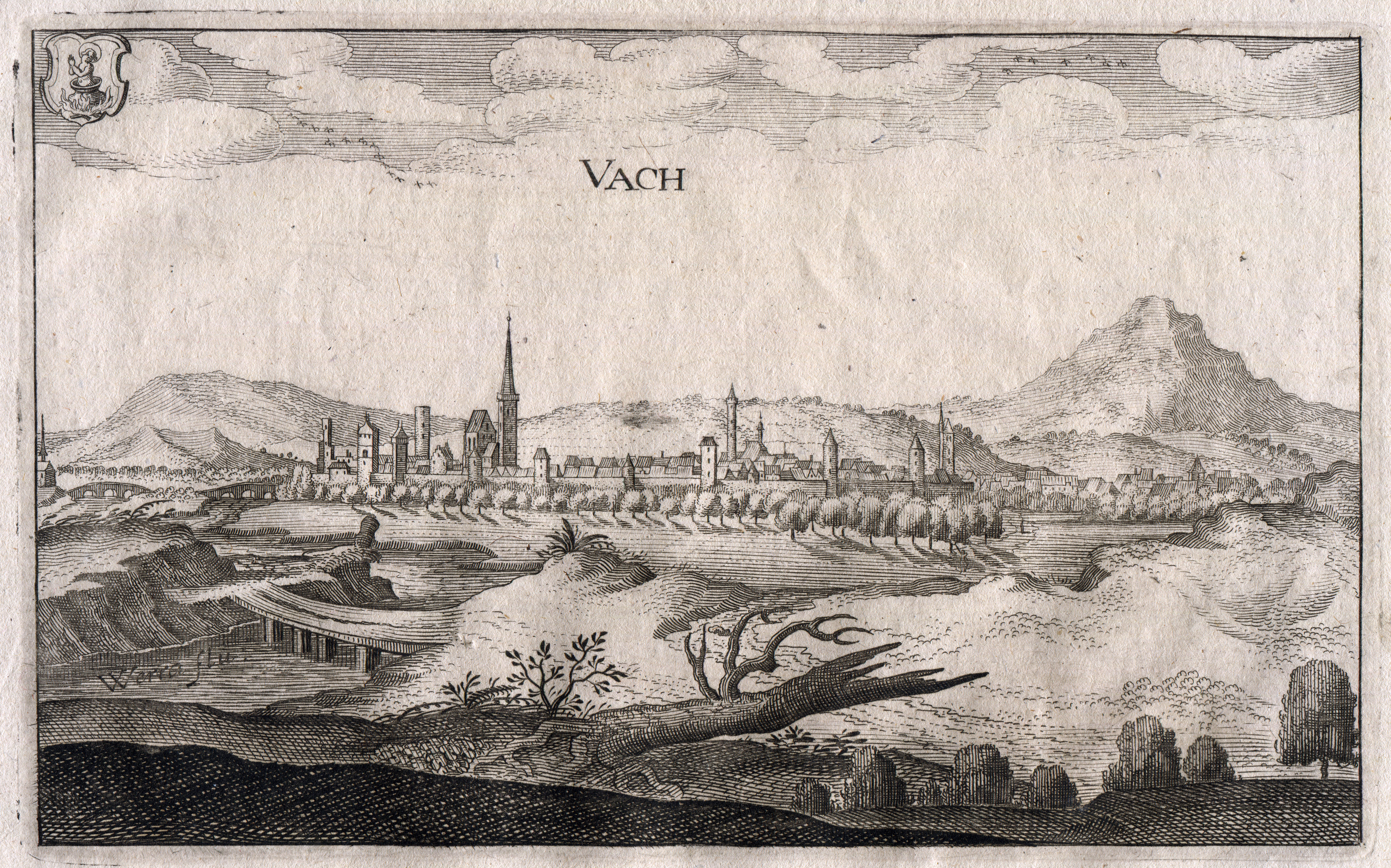 | Beschreibung | Kupferstich von Matthaeus Merian von Vacha in Thüringen (!), mit der mittelalterlichen Schreibweise Vach, die jedoch nicht dem mittelfränkischen Vach entspricht, 1646 | ||