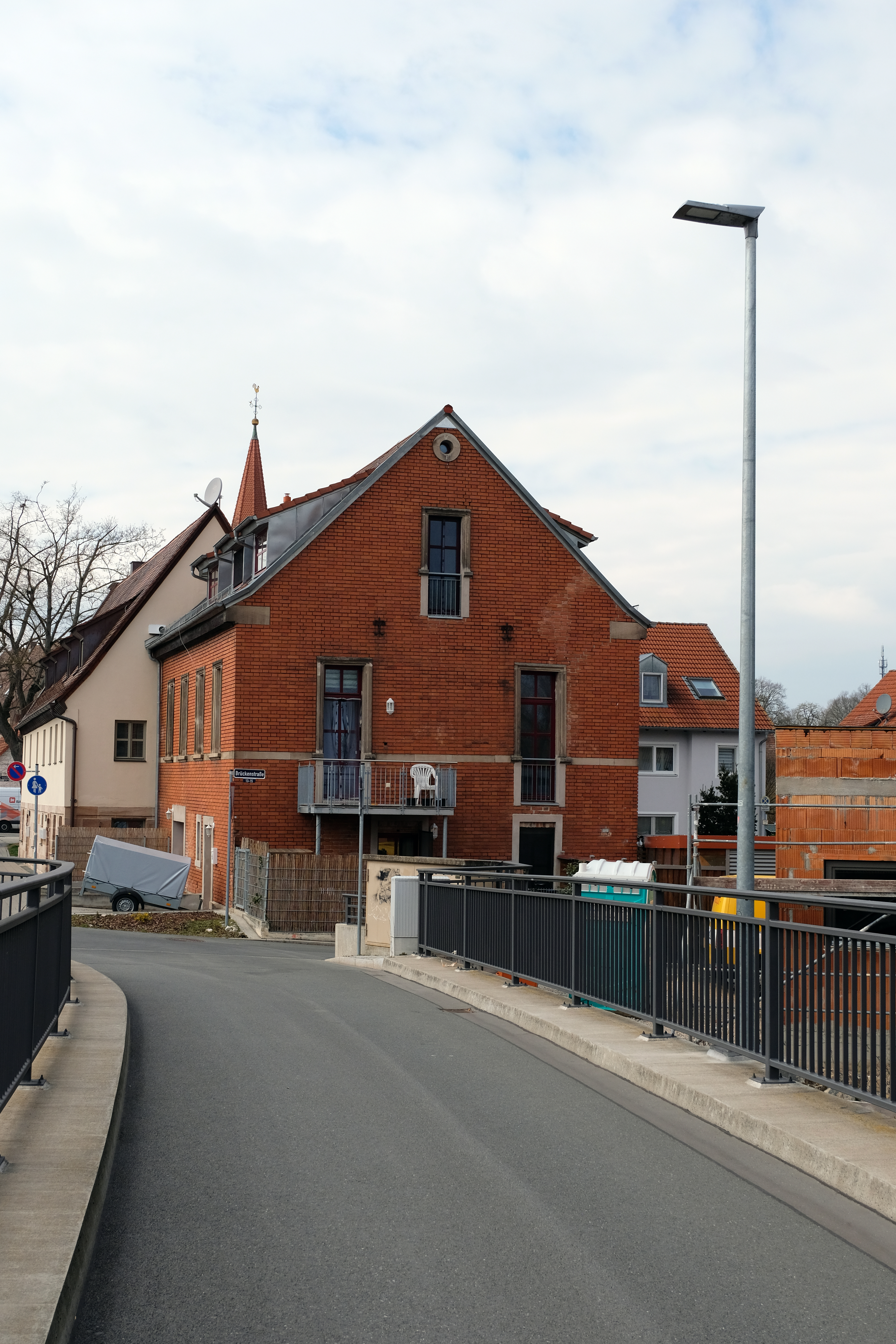 | Beschreibung | Die Vacher Regnitzbrücke, im Hintergrund Haus Brückenstraße 11/11 a, April 2020 | ||