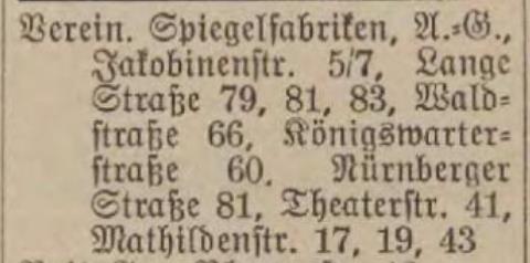 | Beschreibung | Eintrag im Fürther Adressbuch 1931 der Vereinigte Spiegelfabriken mit allen Fürther Adressen | ||