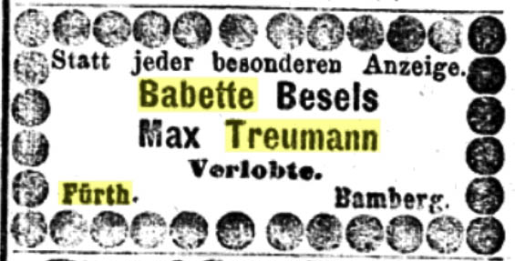 | Dateiinfo (Bild-Unterschrift und Info-Box, automatisch erstellt) | Verlobungsanzeige Max und Babette Treumann, geb. Besels; 23. April 1898 Urheber: Bamberger Tagblatt<br><br>Lizenz: CC BY-SA 3.0 | ||