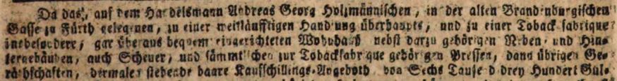 | Beschreibung | Anzeige der Versteigerung einer Tabakfabrik in der damaligen "alten Brandenburgischen Gasse" in der Bayreuther Zeitung vom 21. Januar 1785 | ||