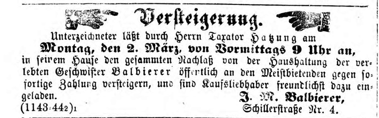 | Beschreibung | Anzeige für Versteigerung Geschwister Balbierer Nachlass, 1874 | ||