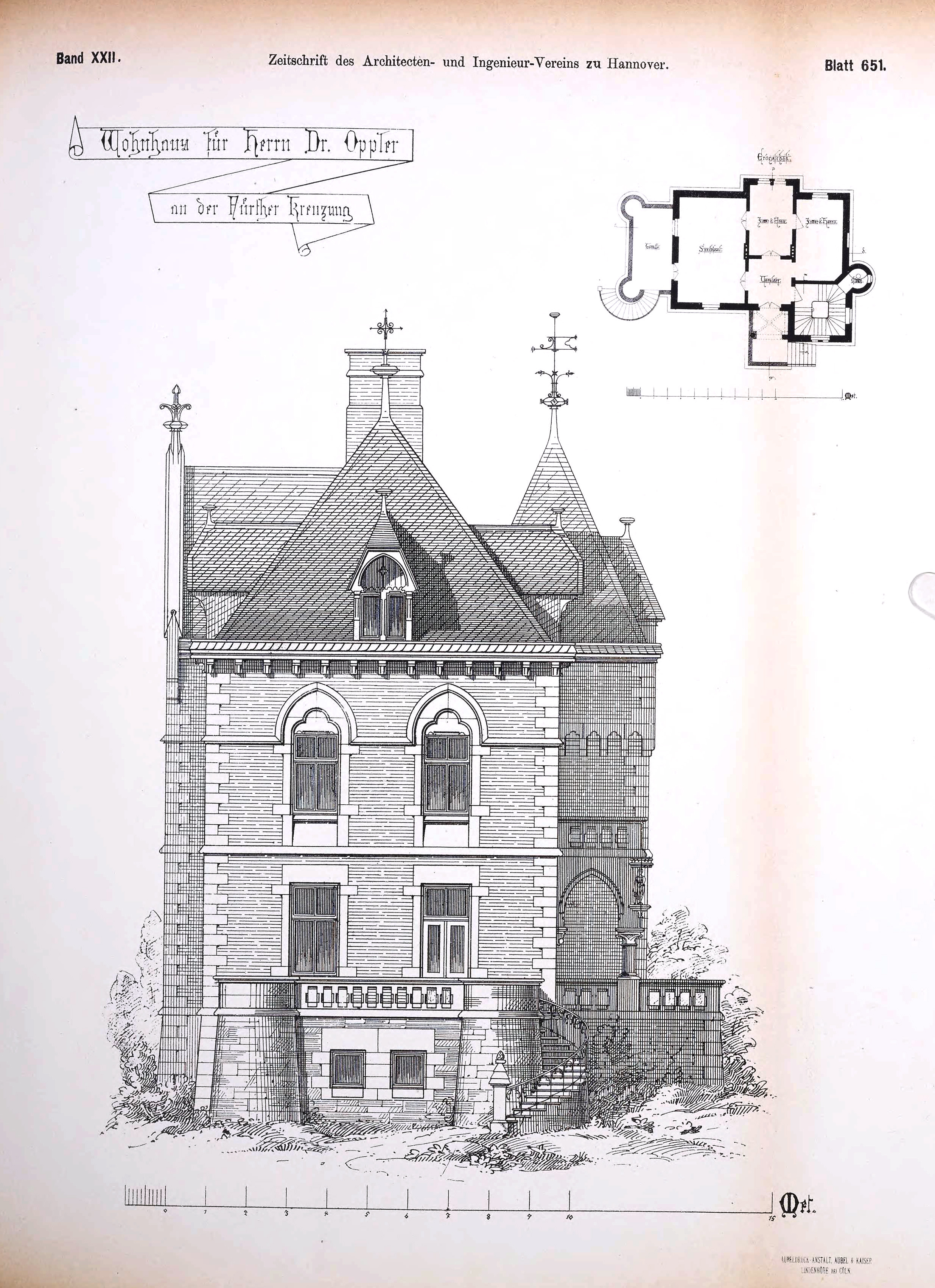 | Beschreibung | Villa Oppler, Entwurf Edwin Oppler (Blatt 651 aus Zeitschrift des Architekten- und Ingenieur-Vereins zu Hannover, 1876, Bestand: Bayerische Staatsbibliothek München, Sign. 2 A.civ. 260 mo-22, urn:nbn:de:bvb:12-bsb11324958-1) | ||