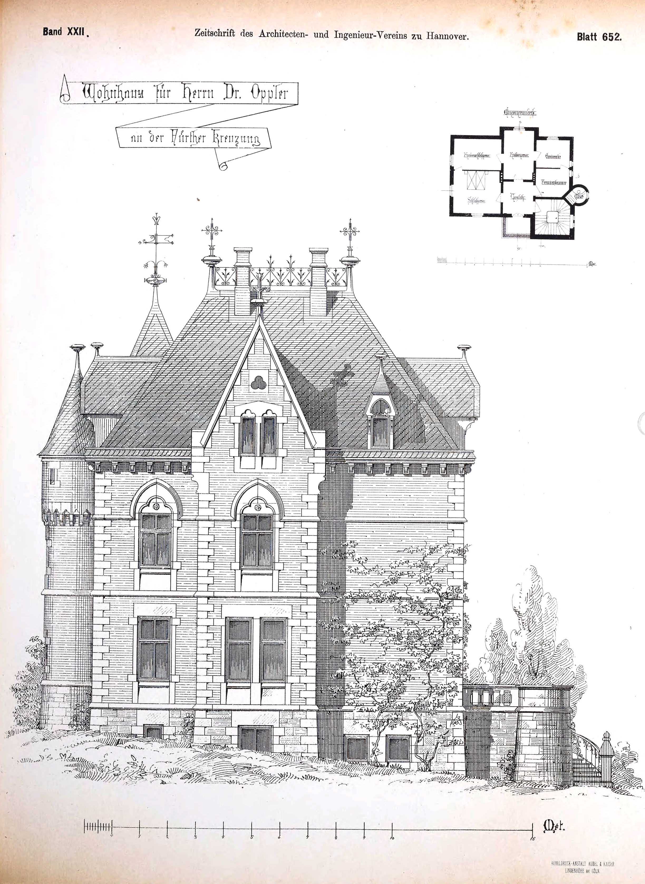 | Dateiinfo (Bild-Unterschrift und Info-Box, automatisch erstellt) | Villa Oppler, Entwurf Edwin Oppler (Blatt 652 aus Zeitschrift des Architekten- und Ingenieur-Vereins ... Villa Oppler, Entwurf Edwin Oppler (Blatt 652 aus Zeitschrift des Architekten- und Ingenieur-Vereins zu Hannover, 1876, Bestand: Bayerische Staatsbibliothek München, Sign. 2 A.civ. 260 mo-22, urn:nbn:de:bvb:12-bsb11324958-1)<br>Urheber: Edwin Oppler<br><br>Lizenz: CC BY-SA 3.0 | ||