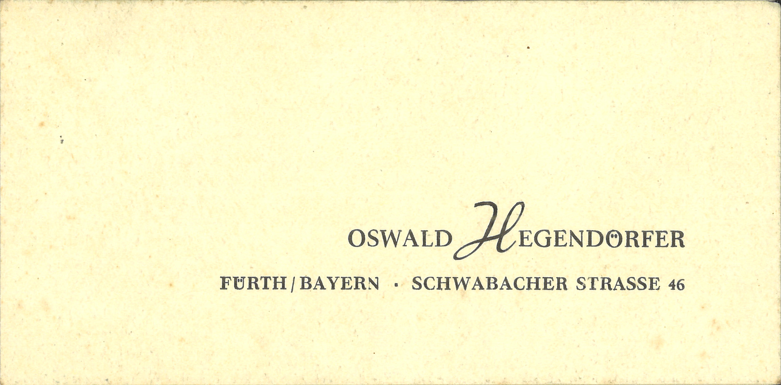 | Beschreibung | Visitenkarte des Lebensmittelhändlers Oswald Hegendörfer, 1950er Jahre | ||