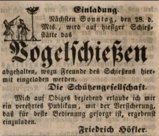 | Dateiinfo (Bild-Unterschrift und Info-Box, automatisch erstellt) | Ankündigung des Vogelschießens, Juni 1846 Lizenz: Out of copyright - non commercial re-use | ||