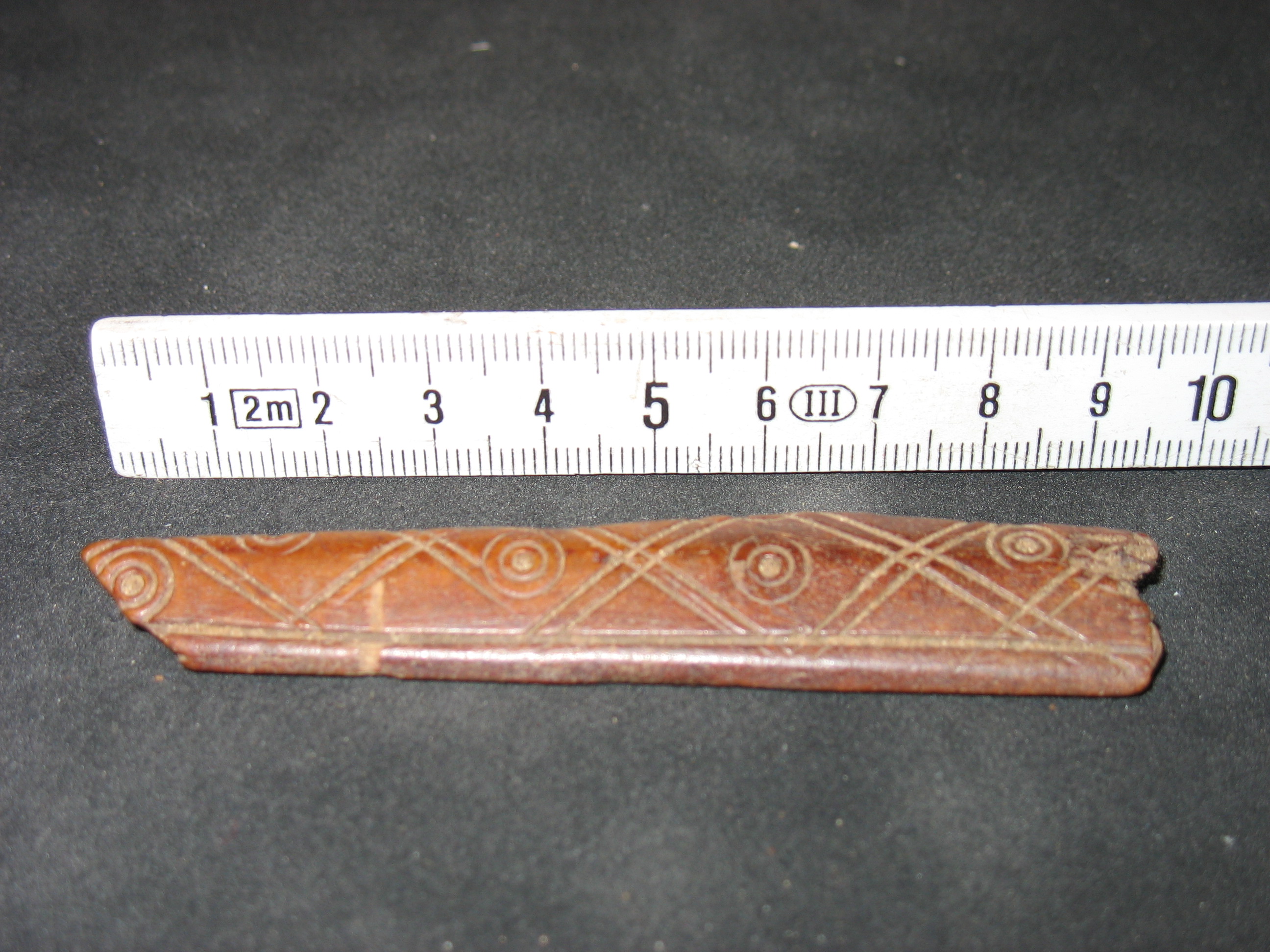 | Beschreibung | Bruchstück einer vorgeschichtlichen Messerscheide o.ä., gefunden im April 2008 am Fuß der Böschung gegenüber dem Quellensteg. Zeitweise im Besitz des Landesamtes für Denkmalpflege, inzwischen wieder beim Finder Dieter Wal. | ||