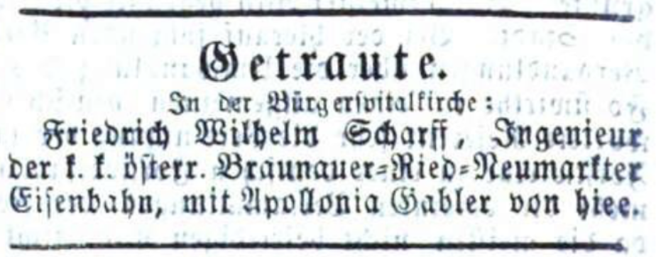 | Beschreibung | Trauanzeige Friedrich Wilhelm Scharff und Apollonia Gabler, Würzburger Journal vom 1. Juni 1869 | ||