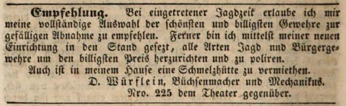 | Dateiinfo (Bild-Unterschrift und Info-Box, automatisch erstellt) | Werbeannonce des Büchsenmachers Daniel Würflein, Oktober 1839 Lizenz: NoC-NC 1.0 | ||