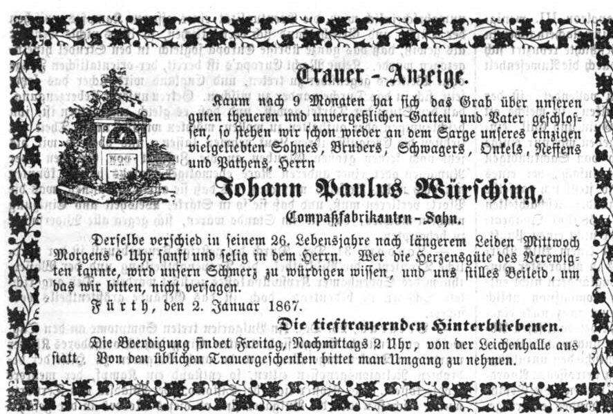 | Beschreibung | Traueranzeige Würsching Sohn, Fürther Tagblatt 3. Januar 1867 | ||