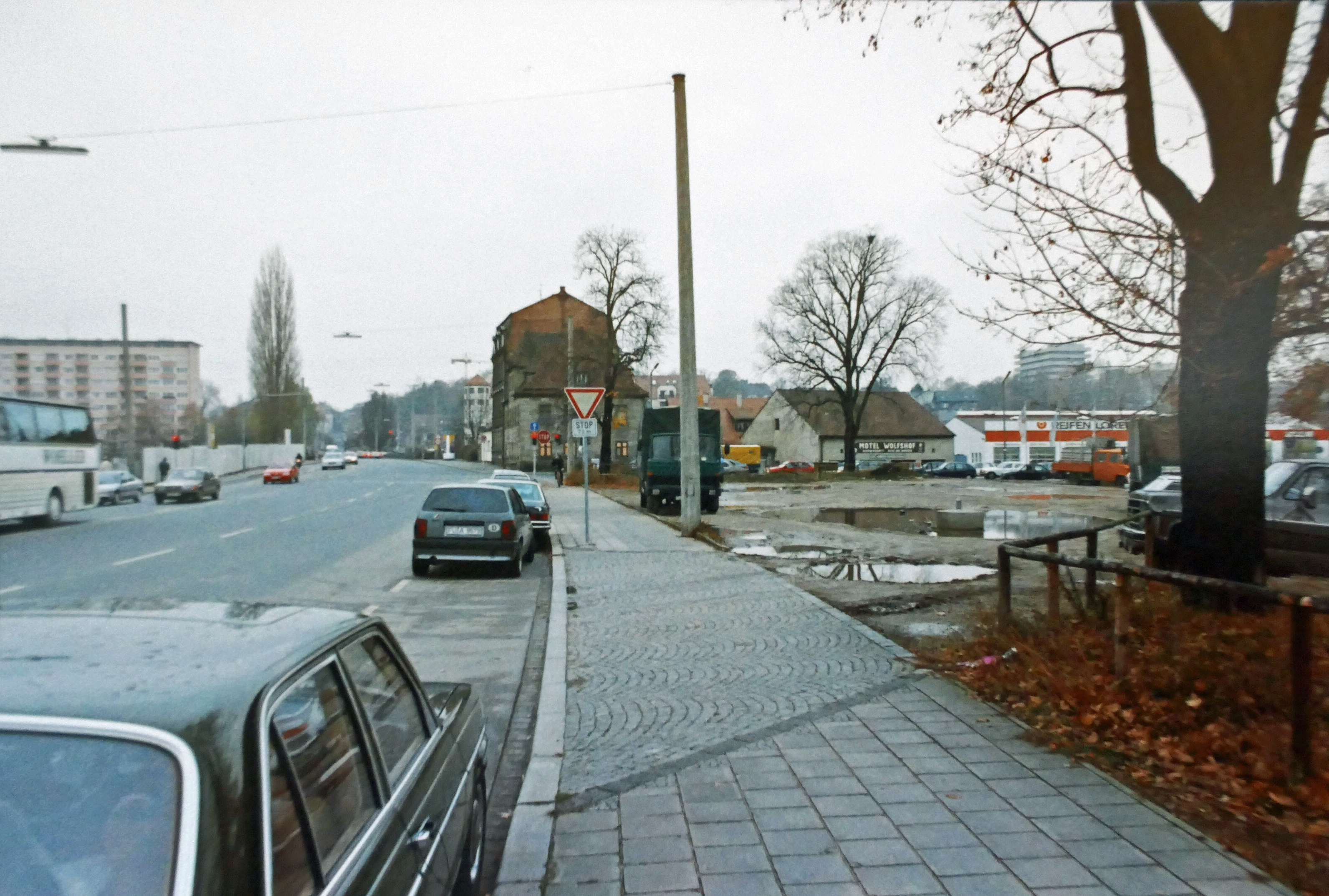| Beschreibung | Blick über die Maxbrücke Richtung Billinganlage, links der Wohnblock Cadolzburger Straße 1, 1994 | ||