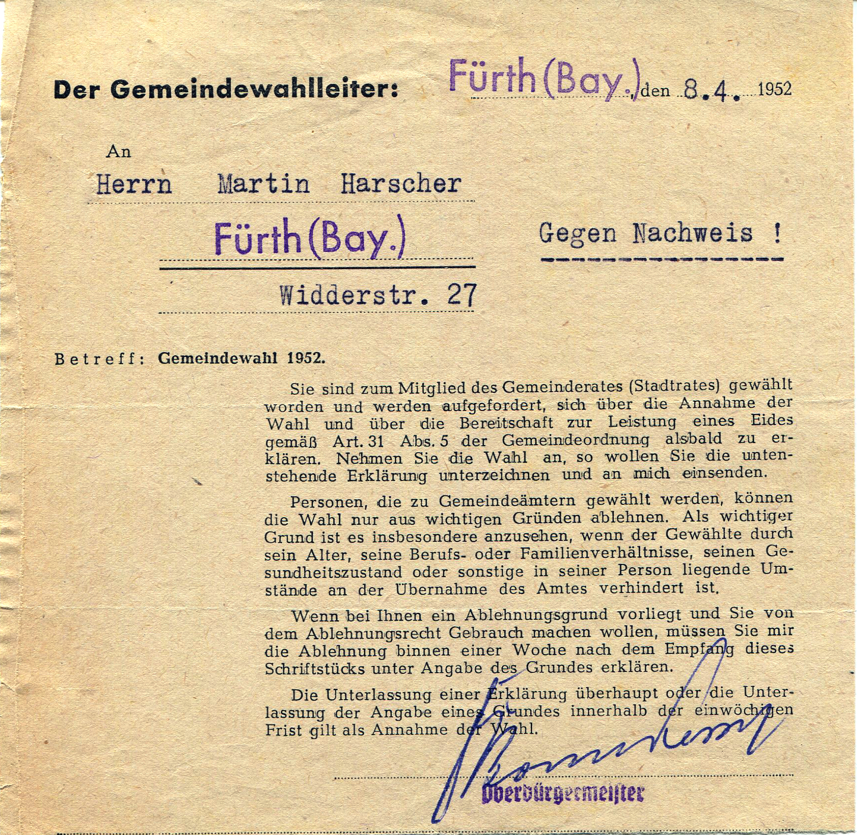 | Beschreibung | Wahl zum Stadtrat von Martin Harscher, 1952 | ||
