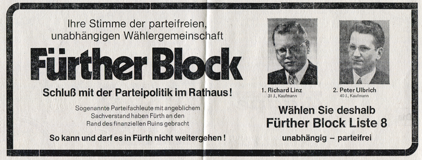 | Beschreibung | Kommunal-Wahlkampfwerbung Fürther Block e. V., Juni 1972 | ||