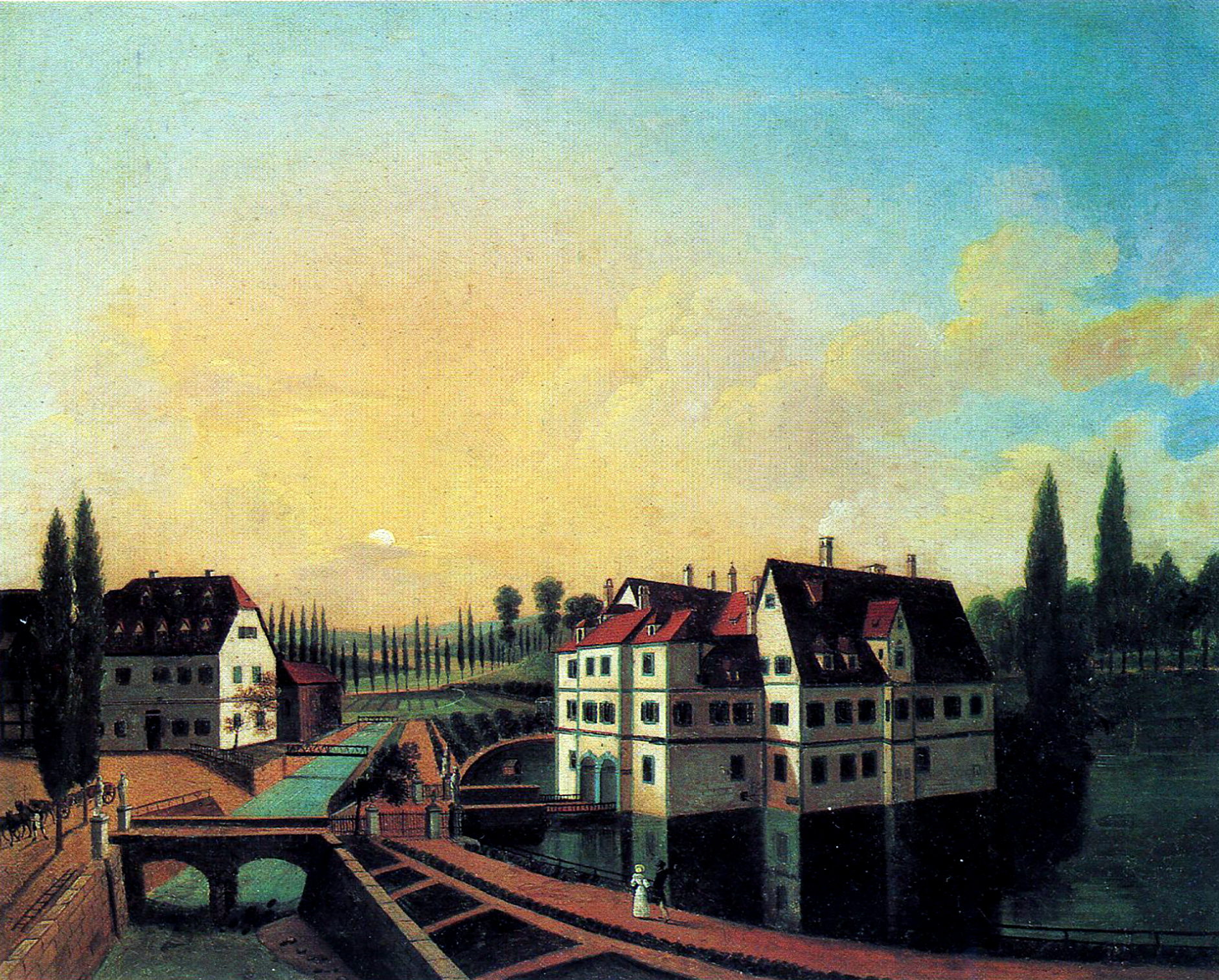 | Beschreibung | Das Wasserschloss Burgfarrnbach um 1830, unbekannter Maler, Bild im Besitz des Stadtarchivs | ||