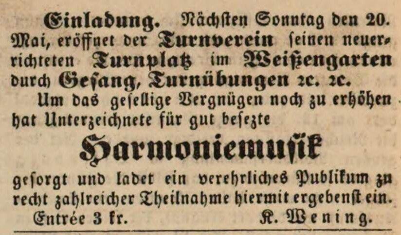 | Beschreibung | Der Turnverein errichtet einen Turnplatz im Weißengarten, Mai 1849 | ||