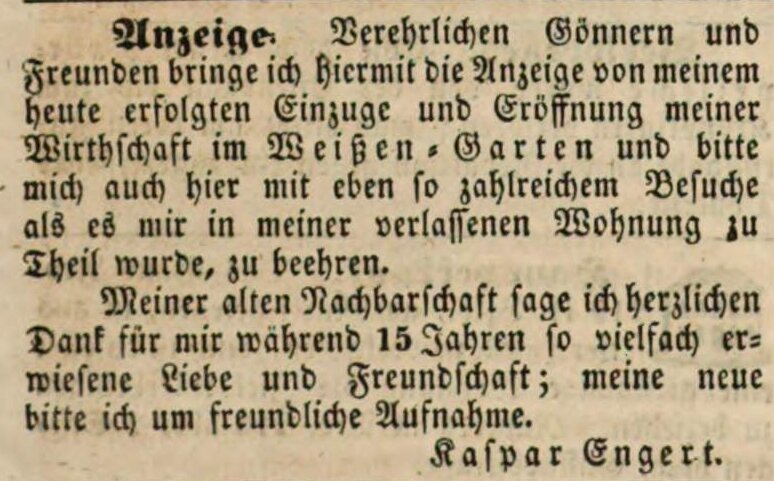 | Beschreibung | Zeitungsanzeige des neuen Wirts im Weißengarten, Kaspar Engert, August 1850 | ||