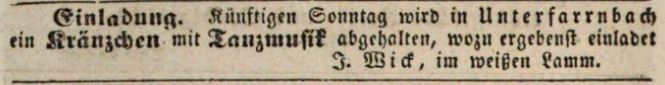 | Beschreibung | Werbeannonce für die Gaststätte zum weißen Lamm in Unterfarrnbach, Mai 1843 | ||