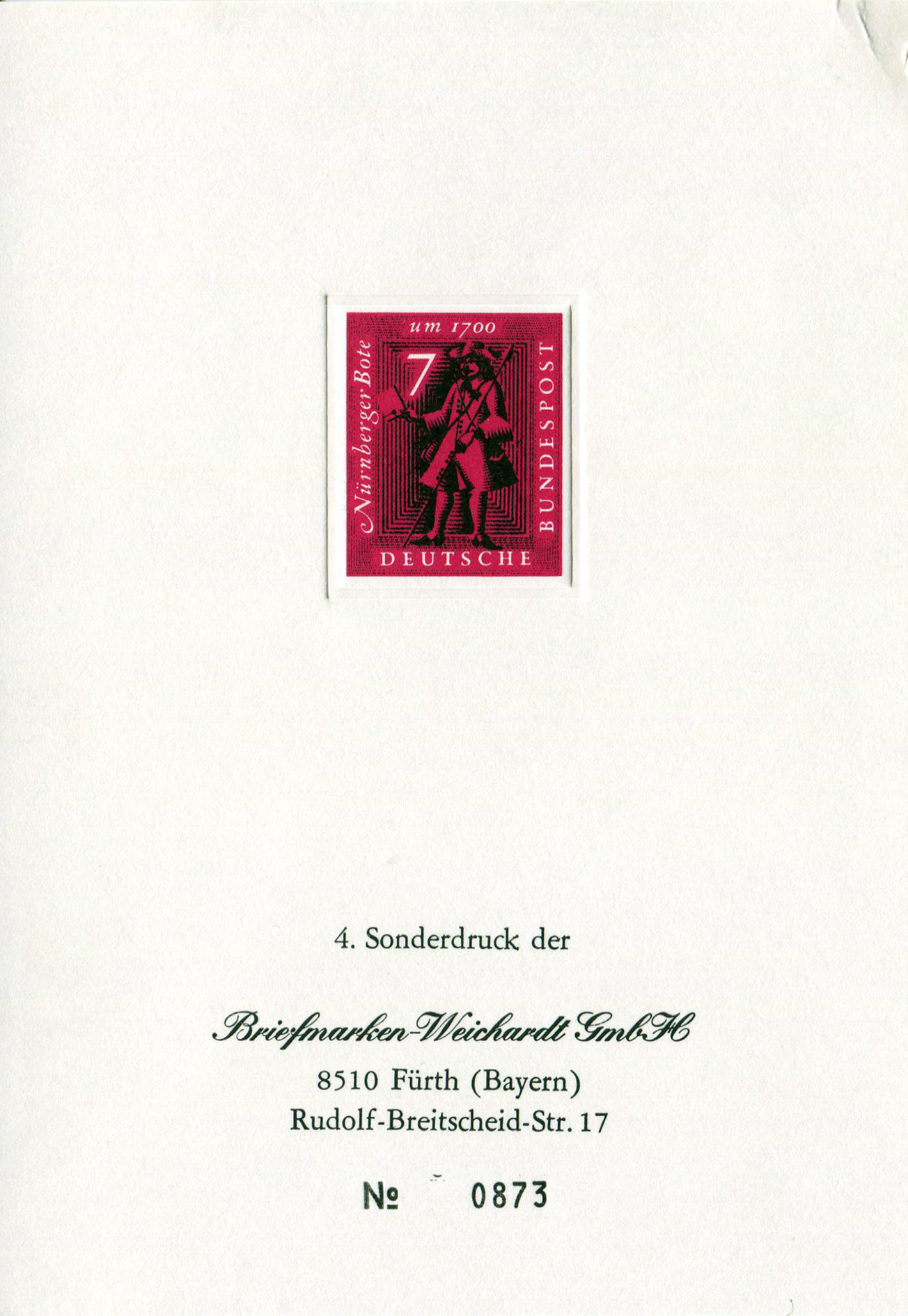 | Beschreibung | 4. Sonderdruck der Briefmarken-Weichardt GmbH, Nr. 873, 1961 | ||