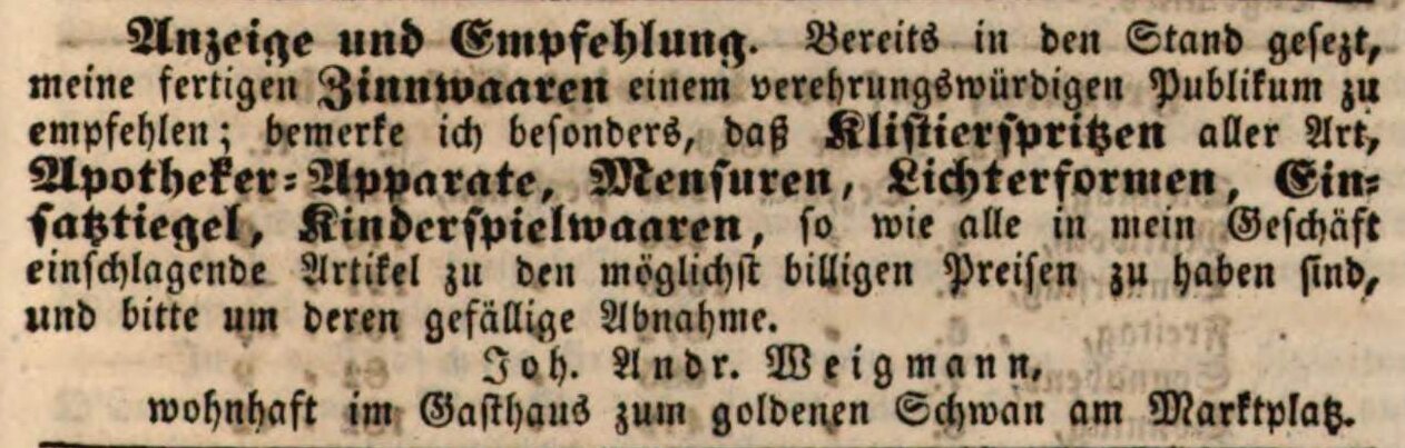 | Beschreibung | Zeitungsannonce des Zinngießers Johann Andreas Weigmann am Marktplatz, Dezember 1839 | ||