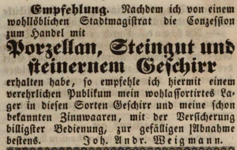 | Dateiinfo (Bild-Unterschrift und Info-Box, automatisch erstellt) | Zeitungsannonce des Zinngießers Johann Andreas Weigmann, März 1845 Lizenz: NoC-NC 1.0 | ||