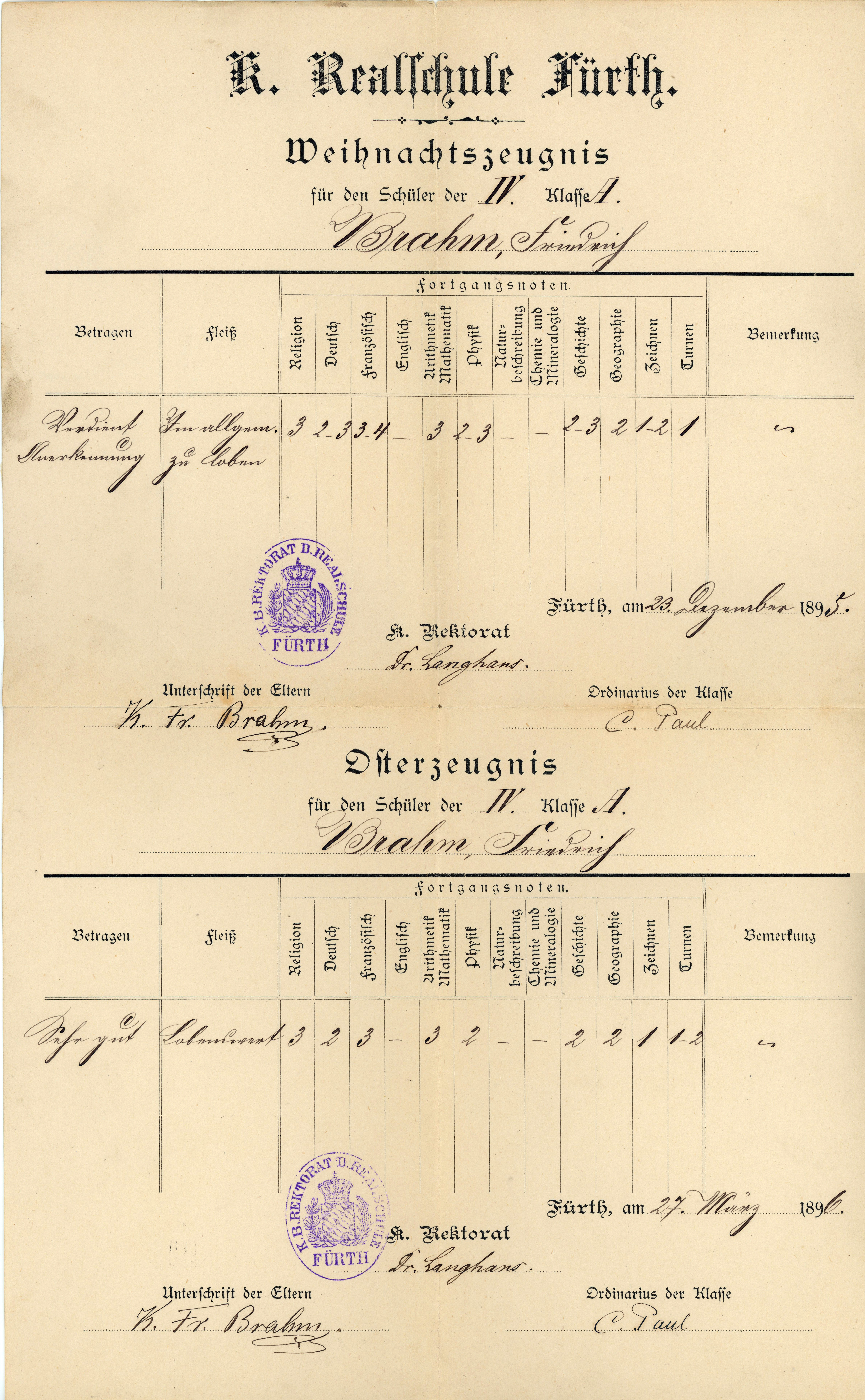 | Beschreibung | Weihnachtszeugnis der Königlichen Realschule unterschrieben von Dr. Langhans, 1895 | ||