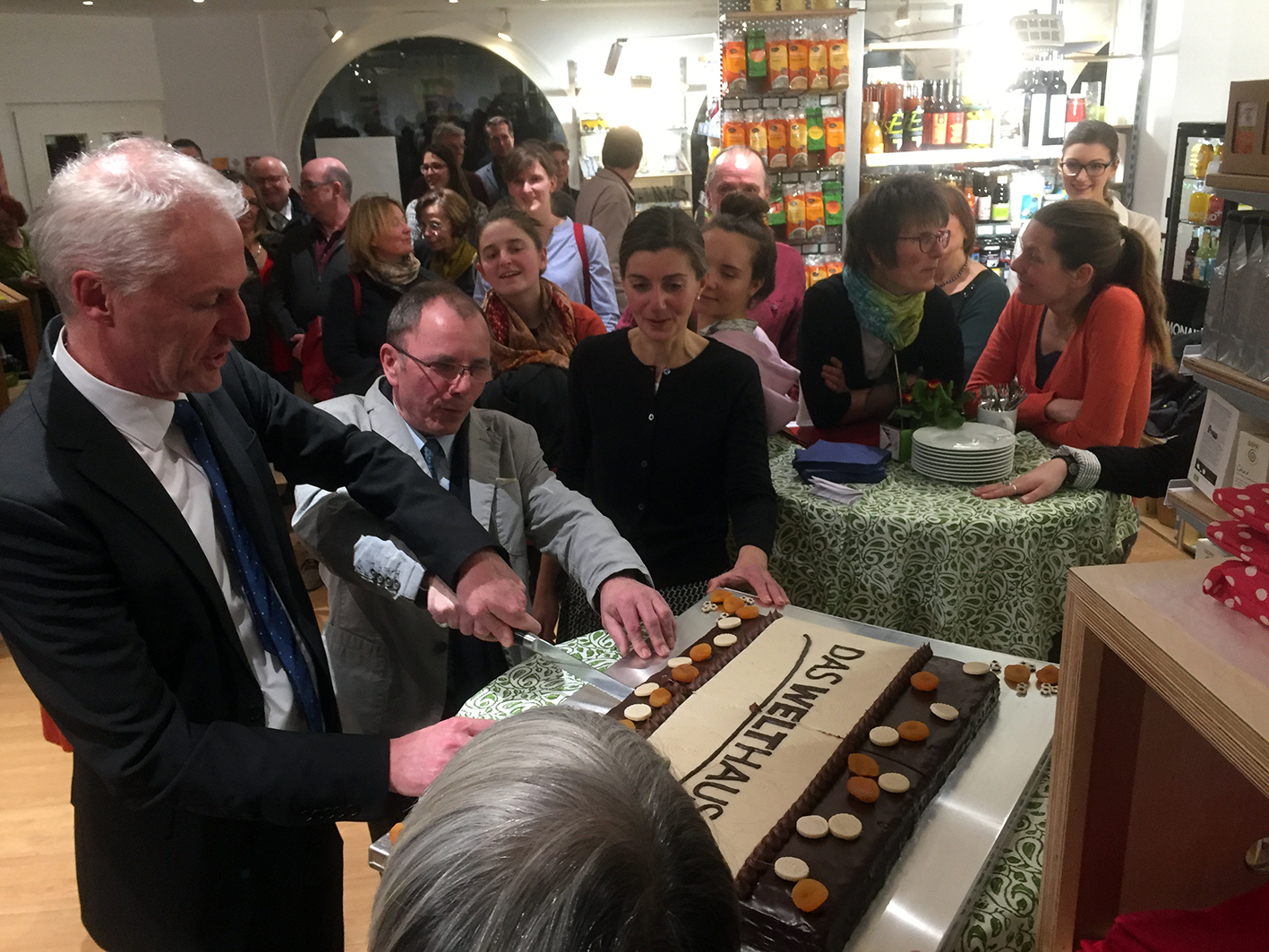 | Beschreibung | Eröffnung des Welthauses Fürth in der Gustavstraße 31, Tortenanschnitt durch Jörg Sichelstiel und André Hermany, März 2017 | ||