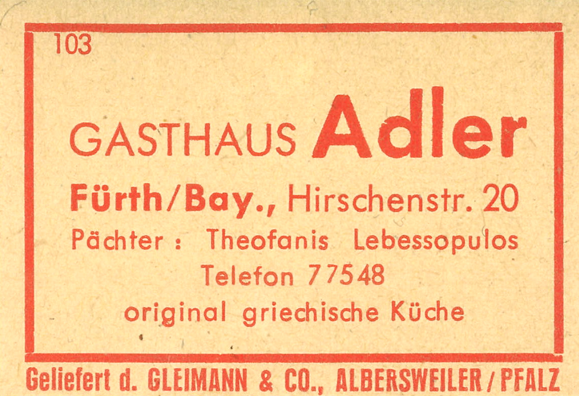 | Dateiinfo (Bild-Unterschrift und Info-Box, automatisch erstellt) | Zündholzschachtel-Etikett des ehemaligen Gasthaus Adler, um 1965 Lizenz: CC BY-SA 3.0 | ||