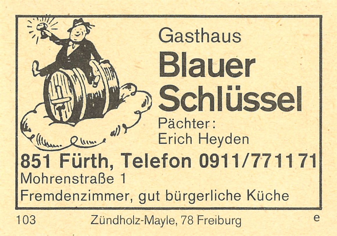 | Beschreibung | Zündholzschachtel-Etikett der ehemaligen Gaststätte Blauer Schlüssel in der Mohrenstraße, um 1965 | ||