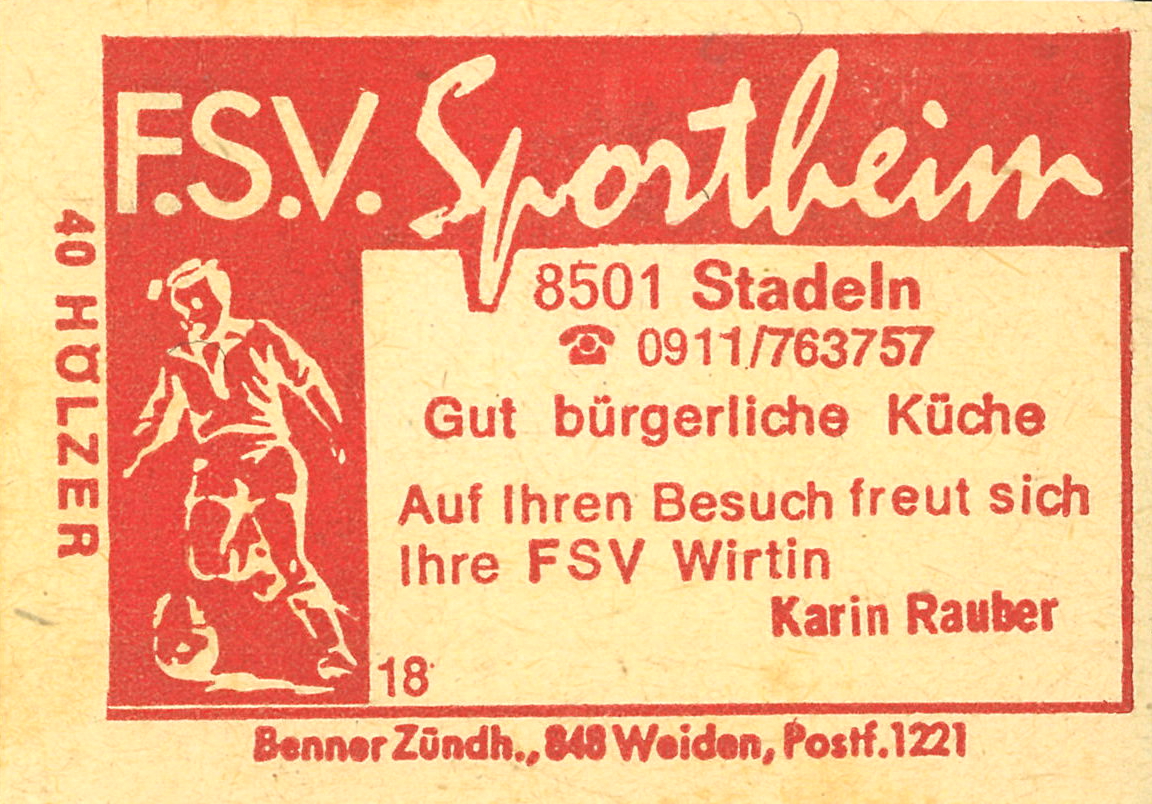 | Dateiinfo (Bild-Unterschrift und Info-Box, automatisch erstellt) | Zündholzschachtel-Etikett der Gaststätte F.S.V. Sportheim, um 1965 Lizenz: CC BY-SA 3.0 | ||