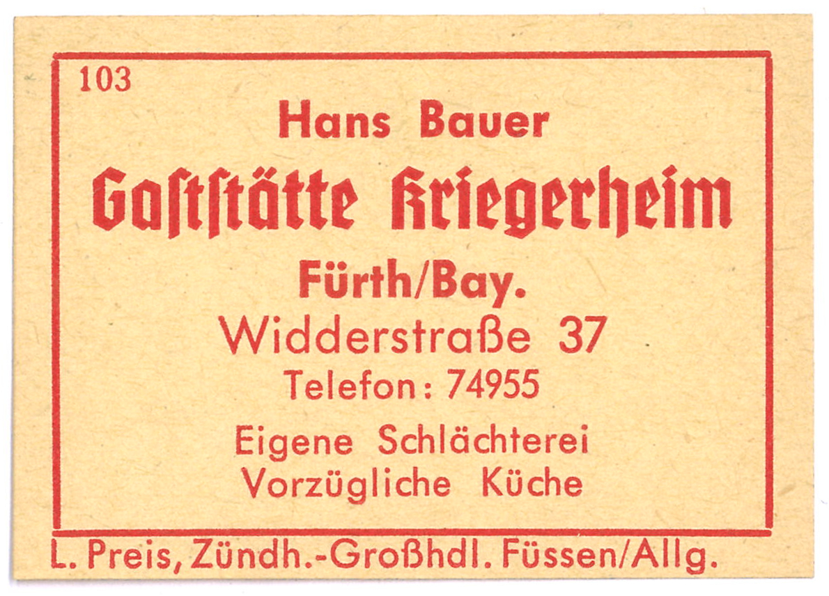 | Beschreibung | Zündholzschachtel-Etikett Gaststätte Kriegerheim, 1960er - 1970er Jahre | ||