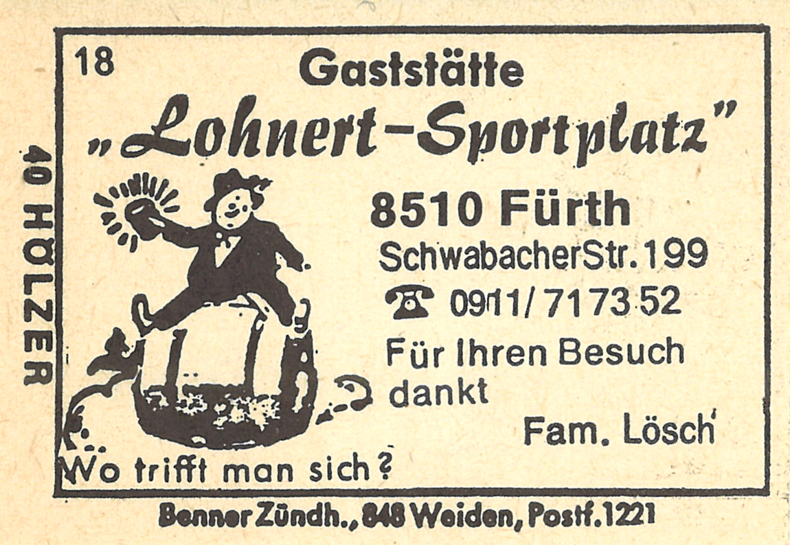 | Beschreibung | Zündholzschachtel-Etikett der ehemaligen Gaststätte Lohnertsportplatz, um 1965 | ||